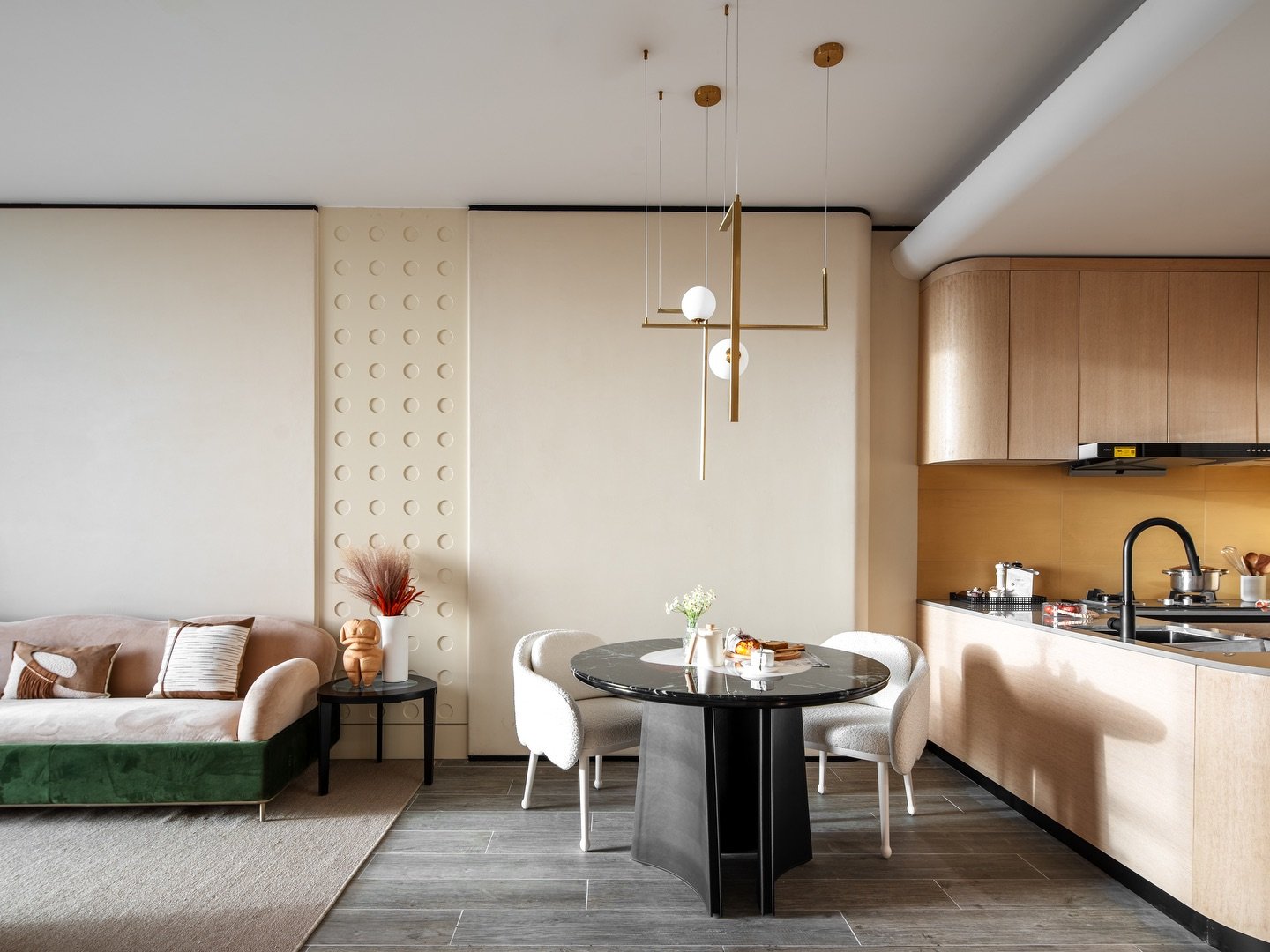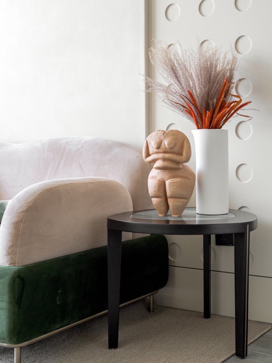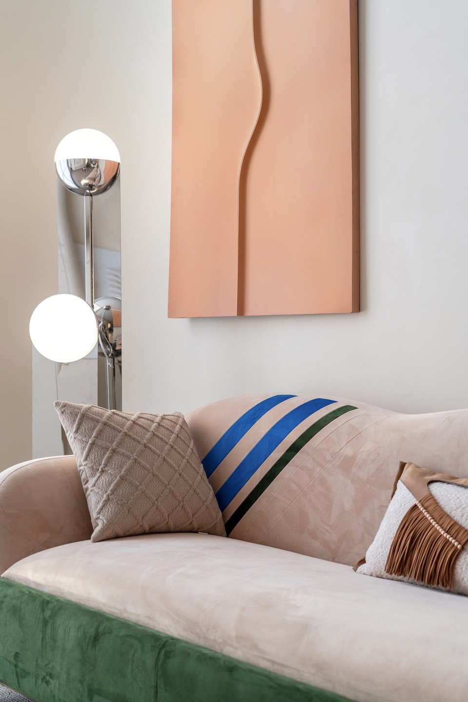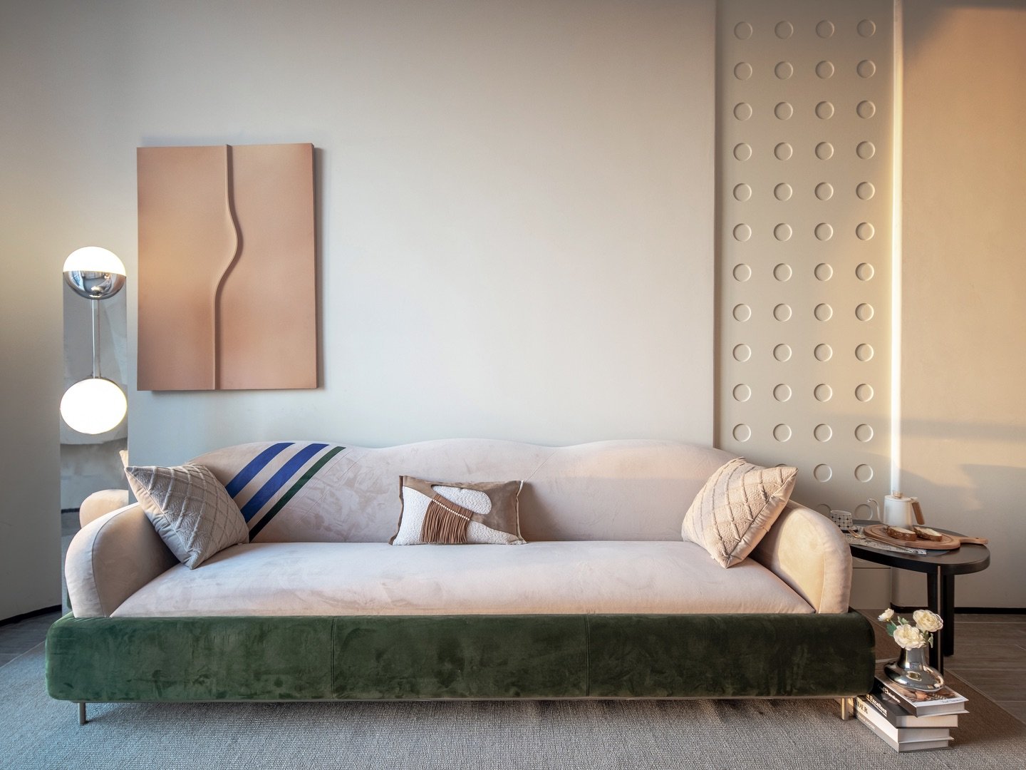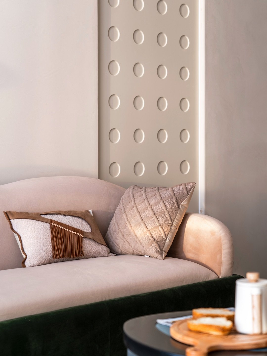 Doma Vibe is a living space, not bound by rigid rules. Here, you will see the circles stand out on colored walls, cream sofa, pink chalk unexpected combination with legs, moss green, or dining table side stones chic black is softened by the chair boucle fabric white.