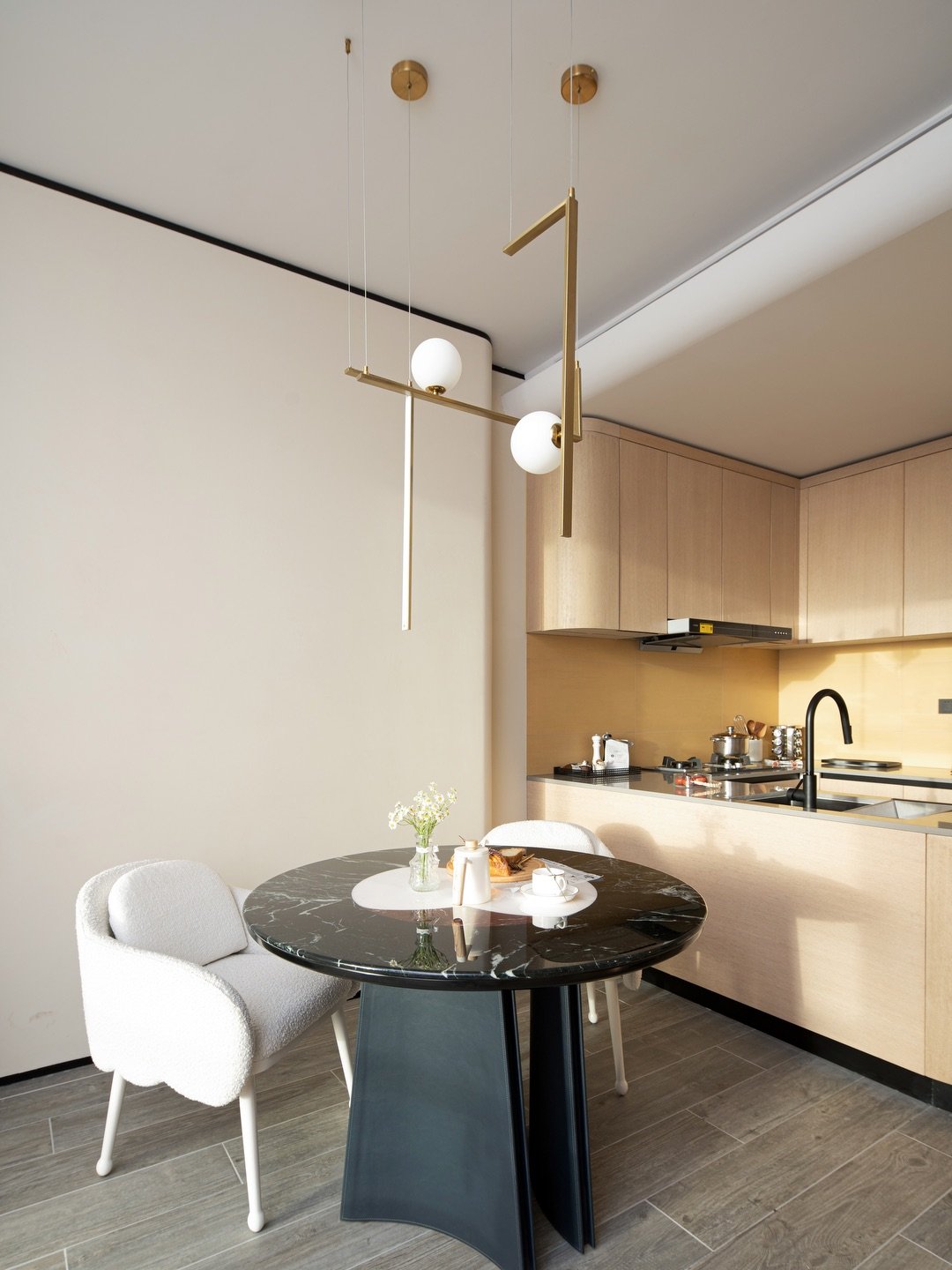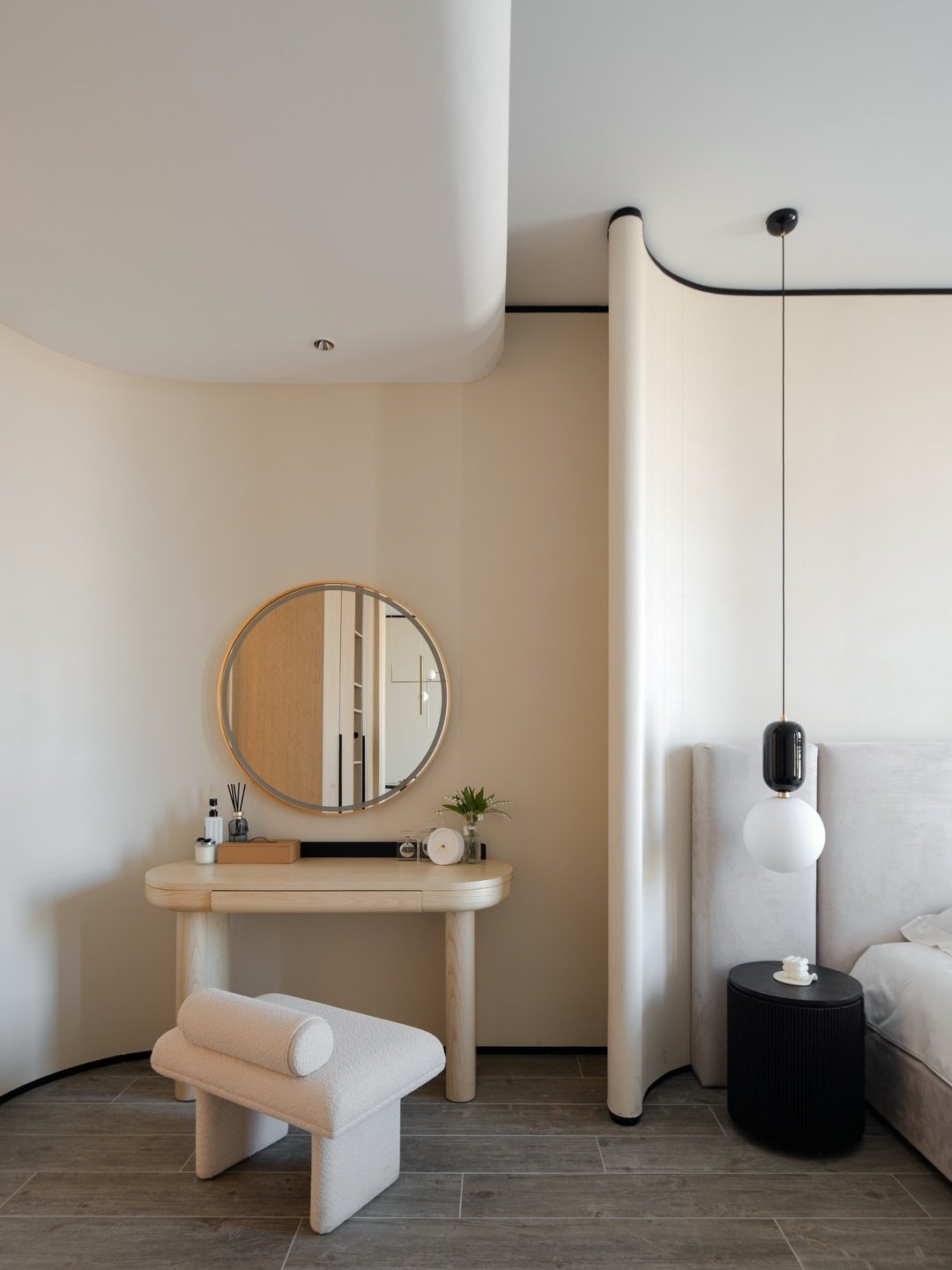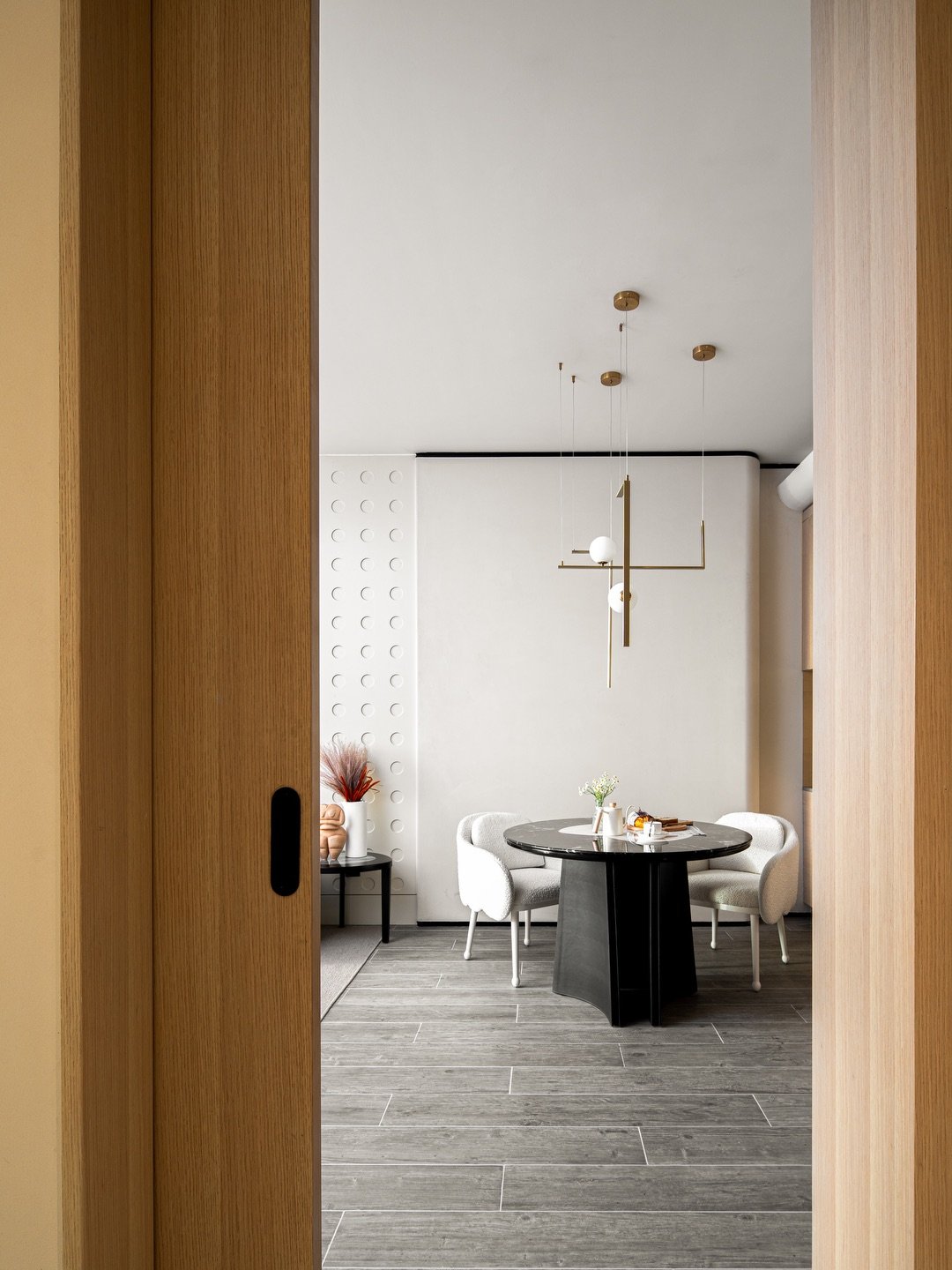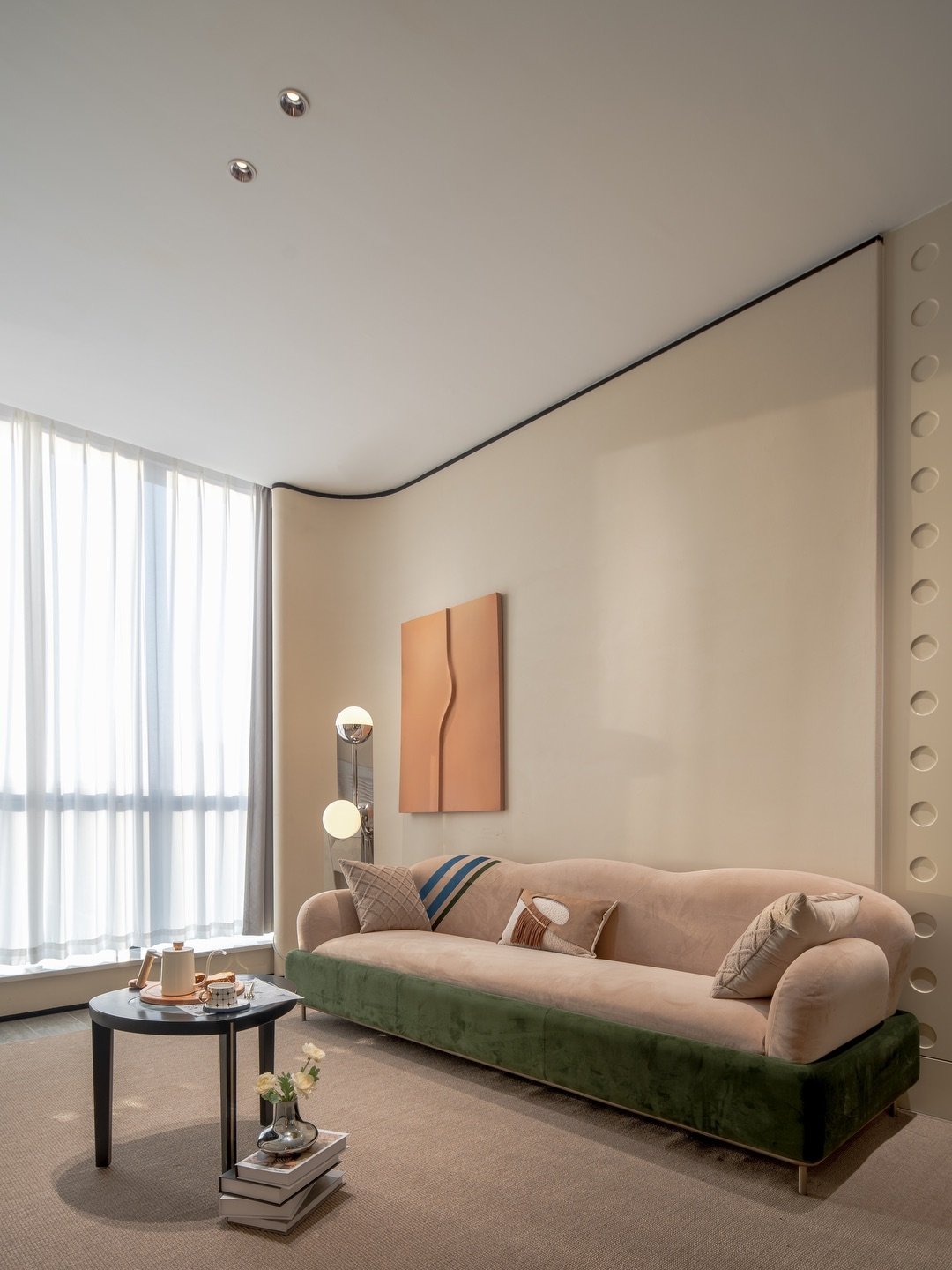 Doma Vibe is a living space, not bound by rigid rules. Here, you will see the circles stand out on colored walls, cream sofa, pink chalk unexpected combination with legs, moss green, or dining table side stones chic black is softened by the chair boucle fabric white.