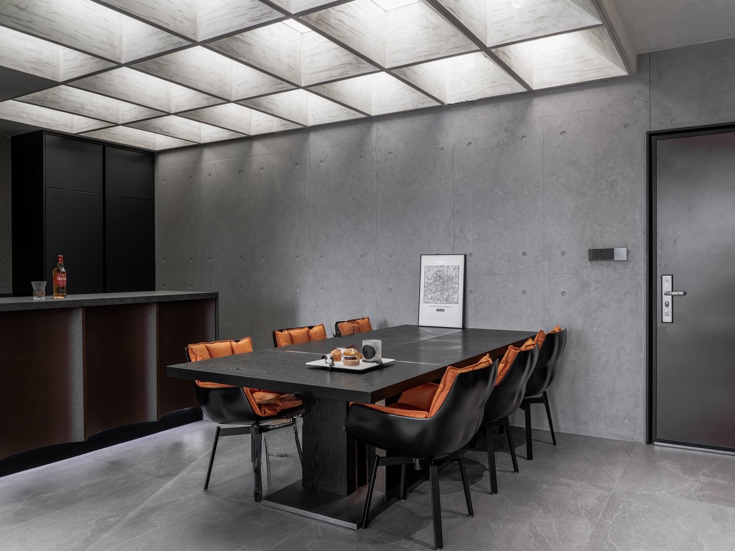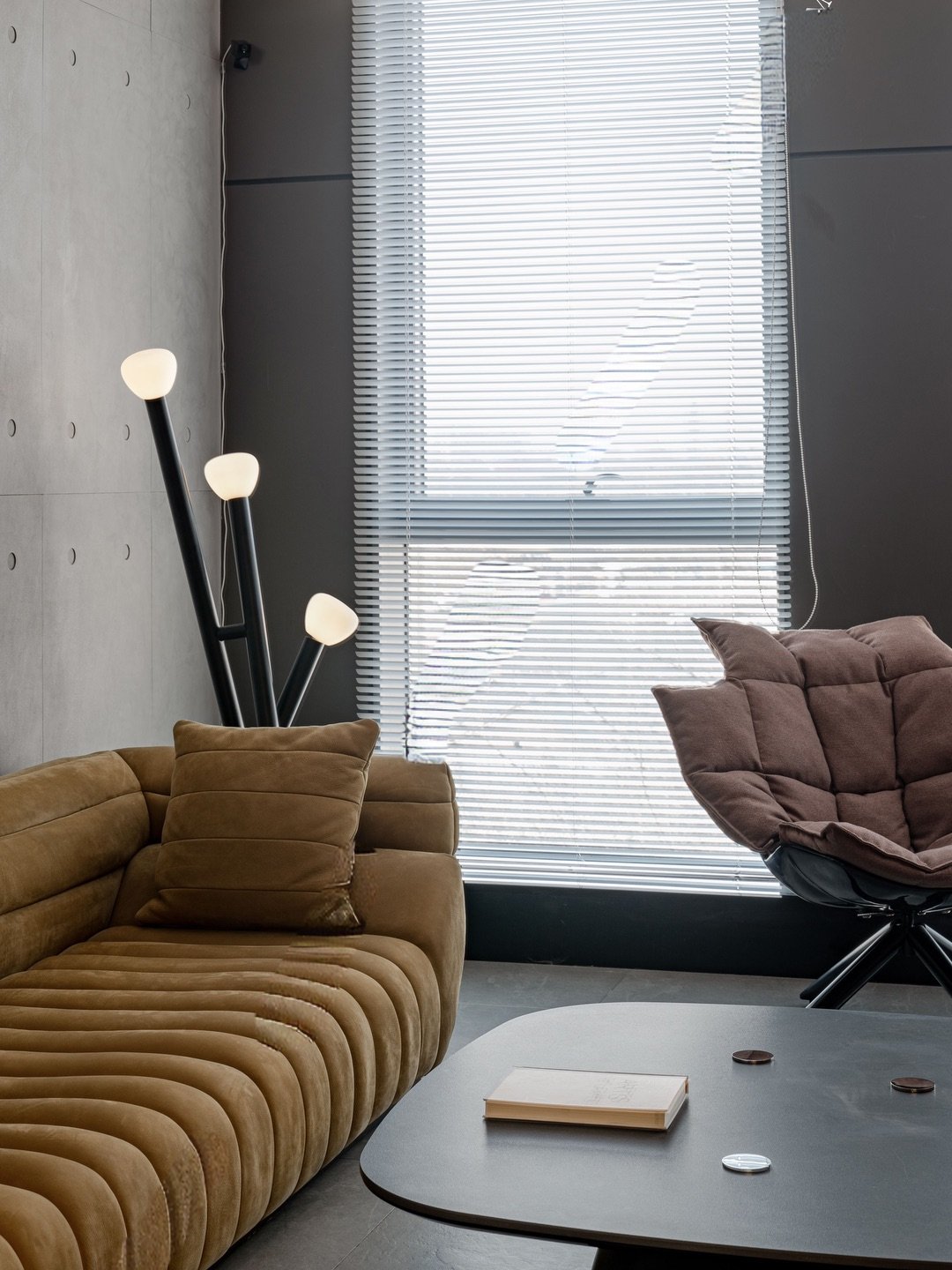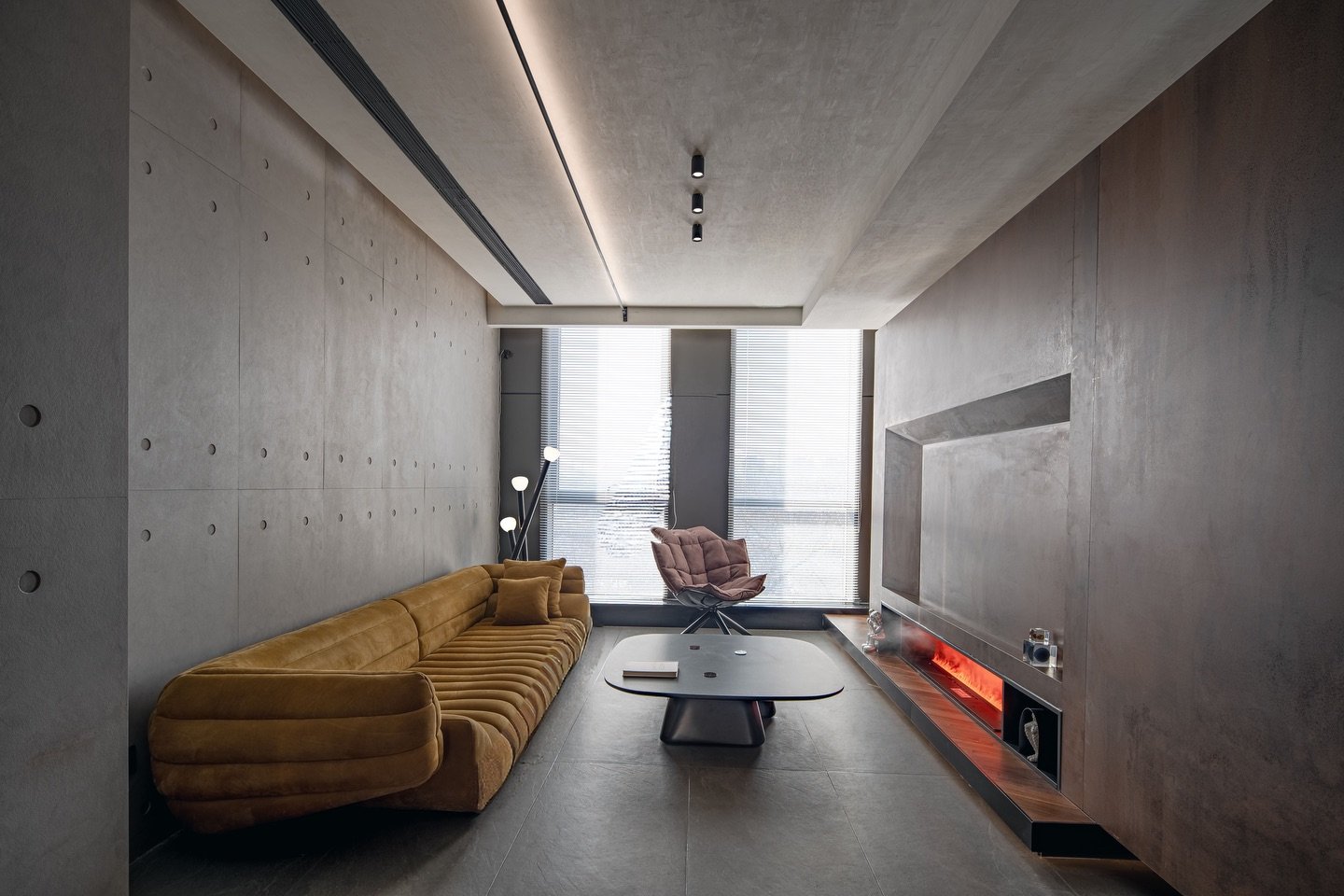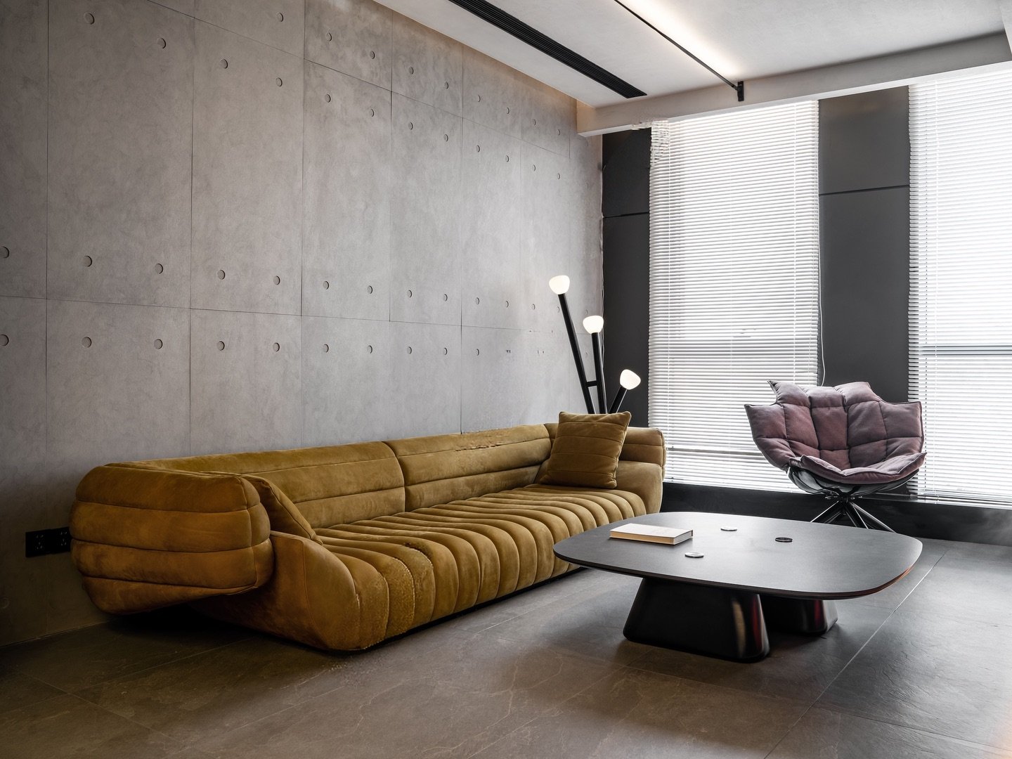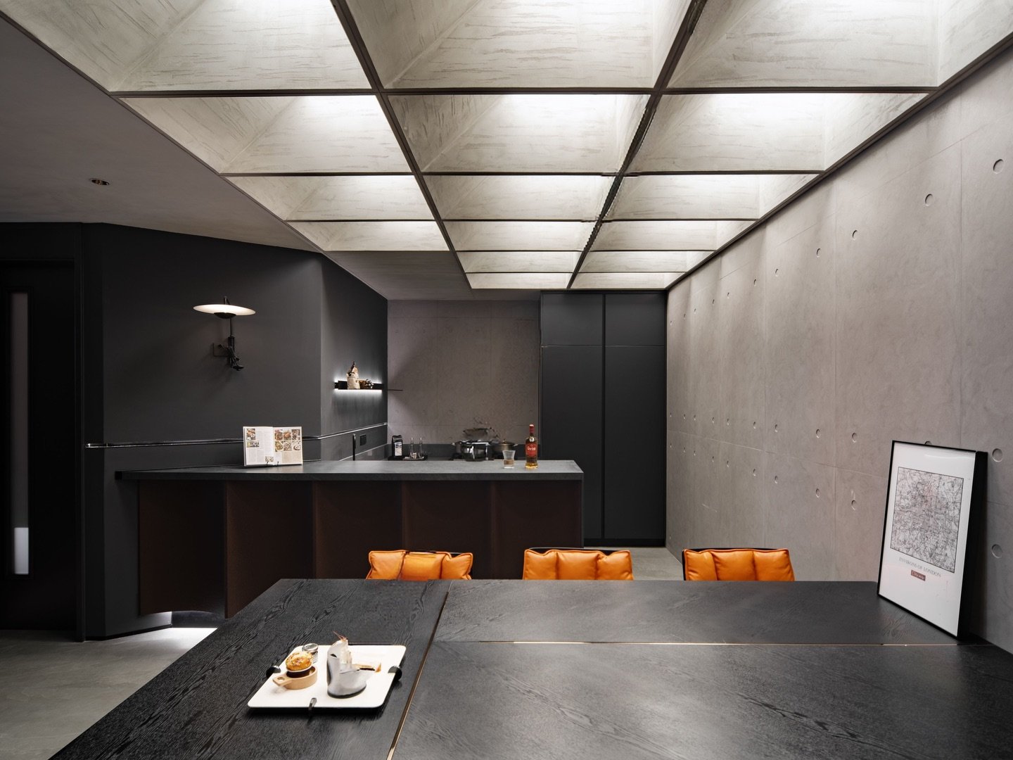 Noirhaus is space for the winter – but for the soul, like the static, but not tedious. Concrete wall dark gray, ceiling reveal texture, marble raw blocks and those blocks black lì is the language center. But then between the tough her sofa brown soil with velvet surface glass back appeared as a saying warm mid-conversation cold.