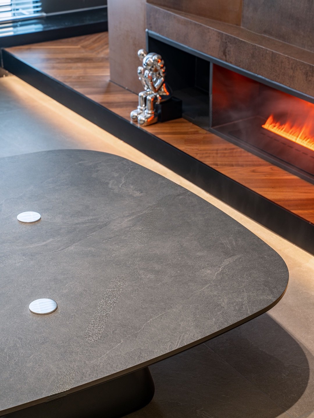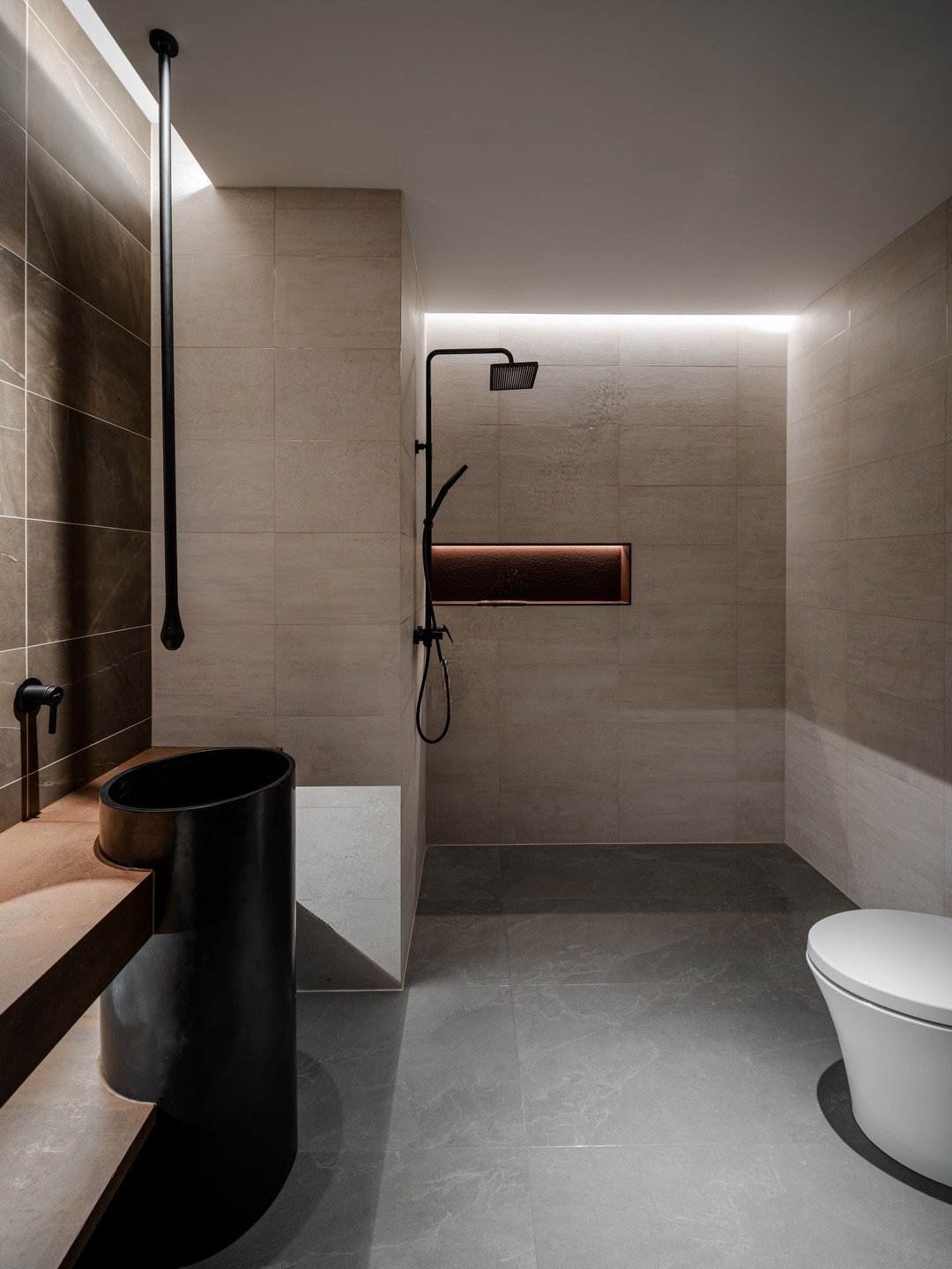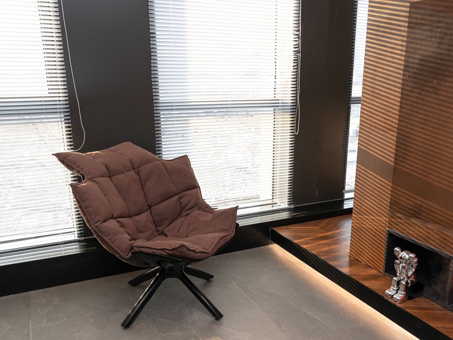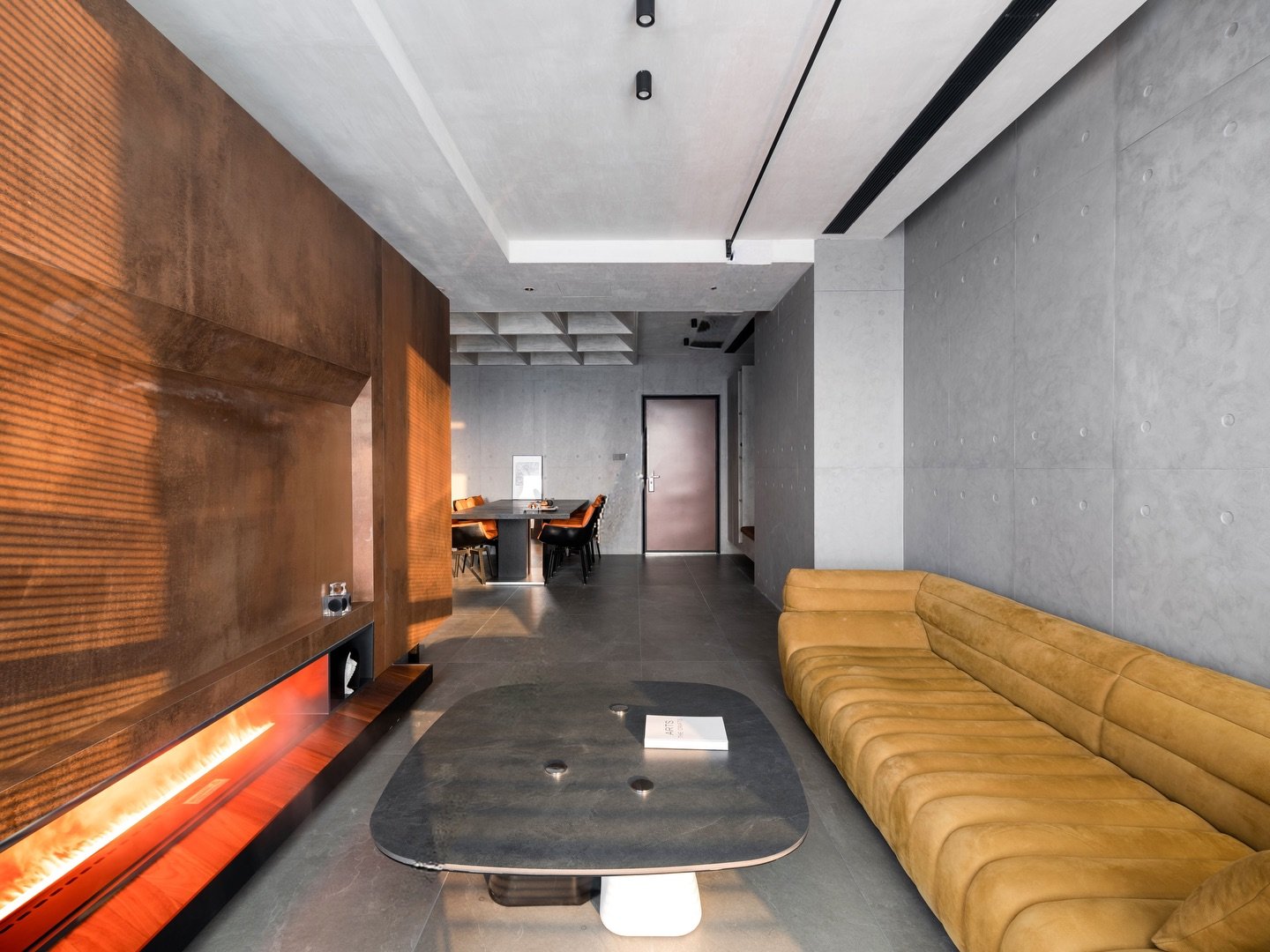 Noirhaus is space for the winter – but for the soul, like the static, but not tedious. Concrete wall dark gray, ceiling reveal texture, marble raw blocks and those blocks black lì is the language center. But then between the tough her sofa brown soil with velvet surface glass back appeared as a saying warm mid-conversation cold.