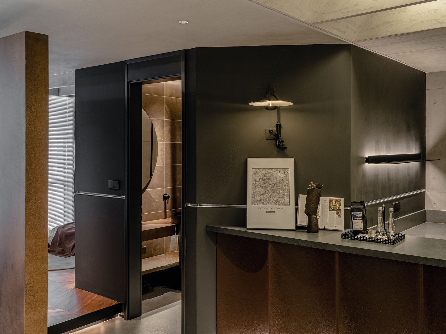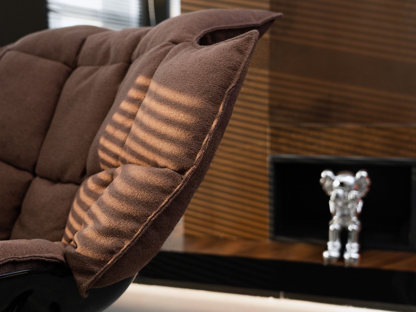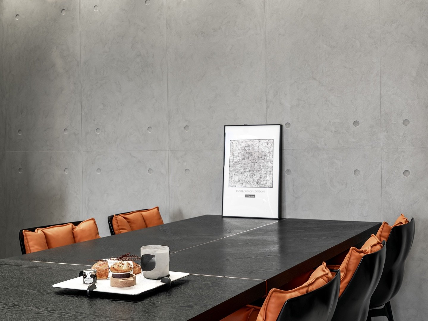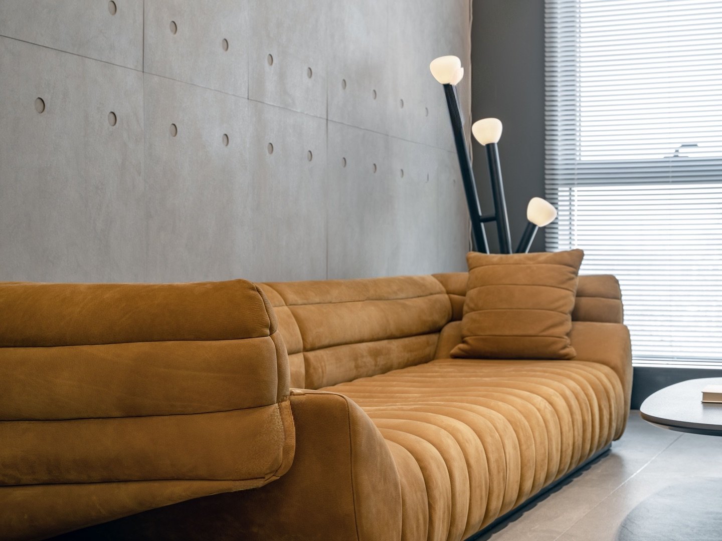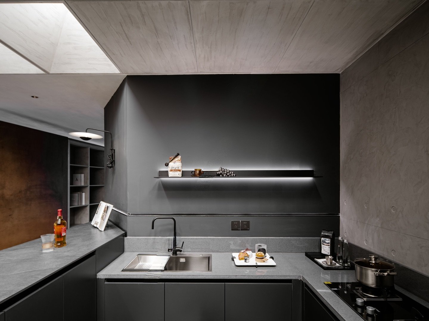 Noirhaus is space for the winter – but for the soul, like the static, but not tedious. Concrete wall dark gray, ceiling reveal texture, marble raw blocks and those blocks black lì is the language center. But then between the tough her sofa brown soil with velvet surface glass back appeared as a saying warm mid-conversation cold.