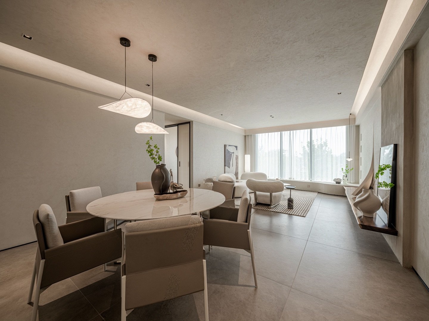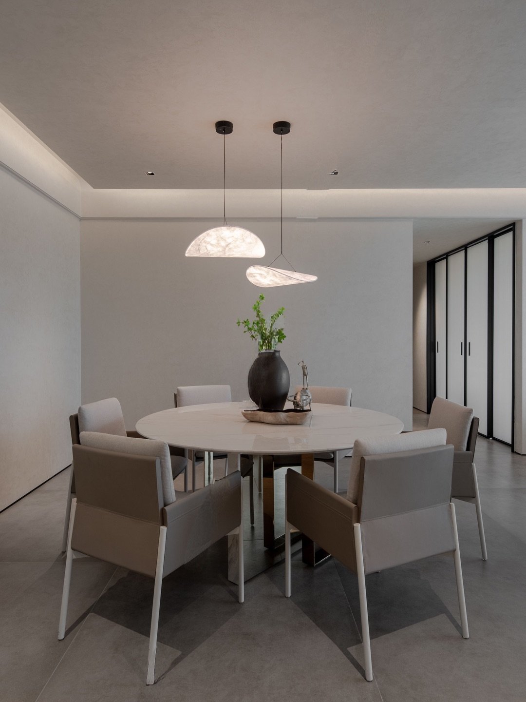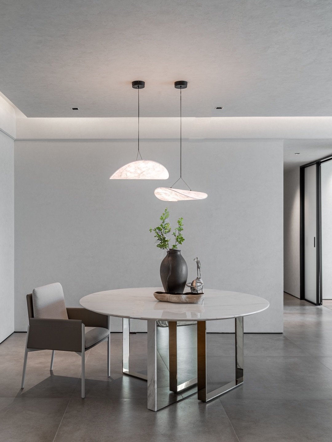 Bề mặt bàn nhẵn bóng, tinh khiết, được chiếu sáng dịu nhẹ bởi đèn thả thiết kế độc đáo, tạo nên không gian ấm cúng, mời gọi những buổi sum họp thân mật. Trong khi đó, những chiếc ghế được bọc bằng chất liệu cao cấp với tông màu tinh tế, không chỉ mang lại sự thoải mái vượt trội mà còn toát lên vẻ thanh lịch đầy ý nhị.